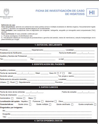 Ficha epidemiológica de investigación de caso de Hidatidosis del Ministerio de Salud de la Provincia de Santa Fe.